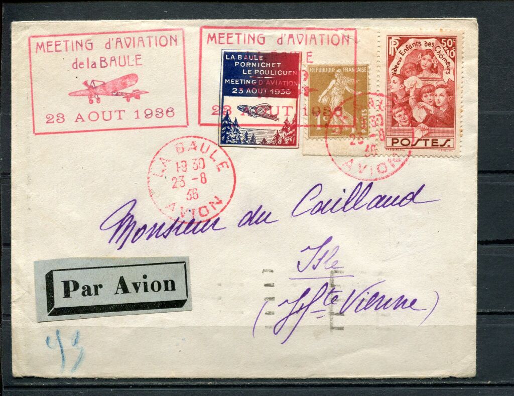 Lettre voyagée pour la Haute Vienne, cachet à date du bureau de poste spécial LA BAULE AVION 23 août 1936 + VIGNETTE SPECIALE tricolore, du Meeting + étiquette par avion en bleu + grande GRIFFE COMMEMORATIVE, frappe en rouge, 30 x 48 mm " Meeting d' aviation de la Baule, 28 août 1936, illustration d' un monoplan. - affranchissement 1c semeuse bistre olive (277 a) + 50+10c au profit des enfants des chômeurs ( 312 ). - au dos, CAD transit Paris 24 août avec flamme " gagnez du temps répondez par avion " & arrivée Isle Hte Vienne 25 août. - MULLER 313