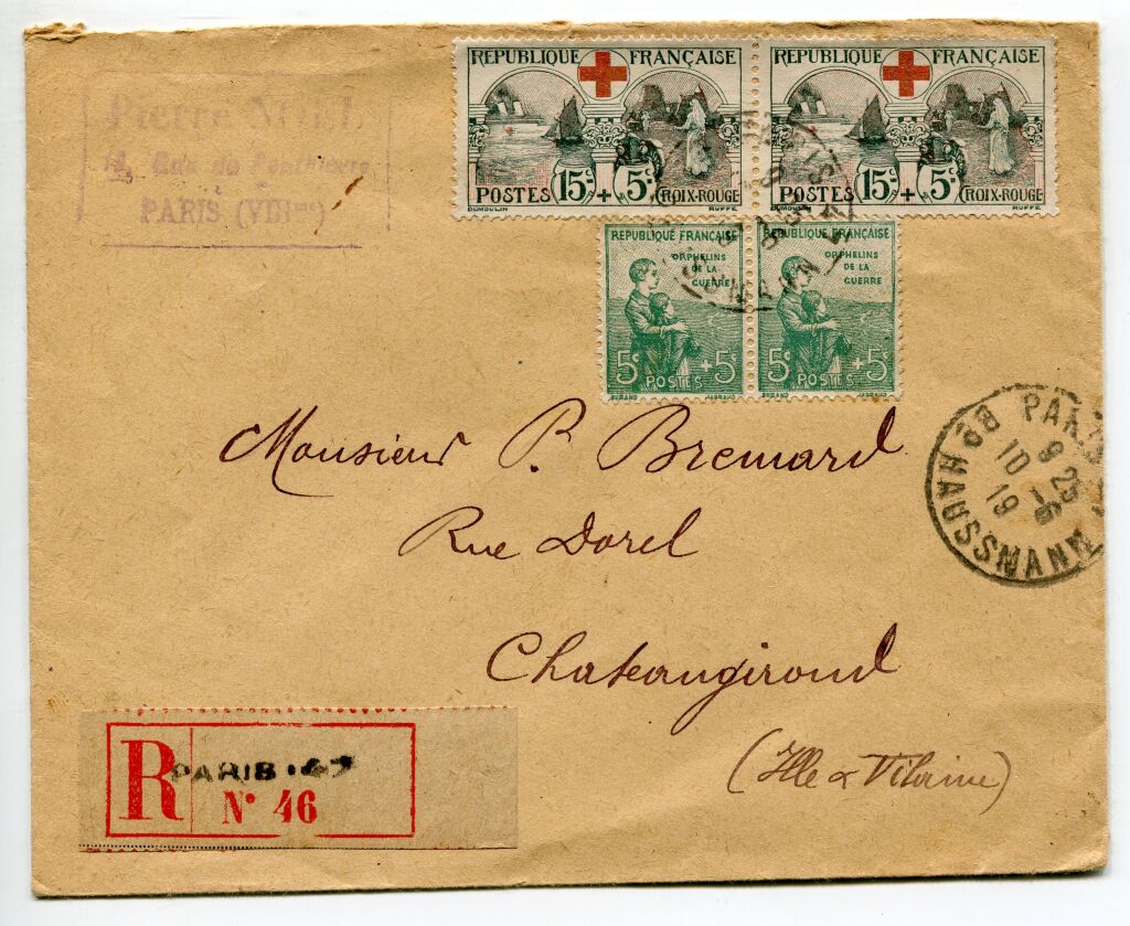 FRANCE - BEL AFFRANCHISSEMENT EXCEPTIONNEL - Lettre recommandée au départ de Paris pour Chateaugiron / Ille & Vilaine - Cachet à date départ Paris 149 Bd Haussmann 10 juin 1916. Rare affranchissement avec PAIRE du n° 156 1er timbre Croix Rouge grand format " Infirmière " + paire du 5c + 5c de la 1ère série des orphelins de la guerre n° 149.