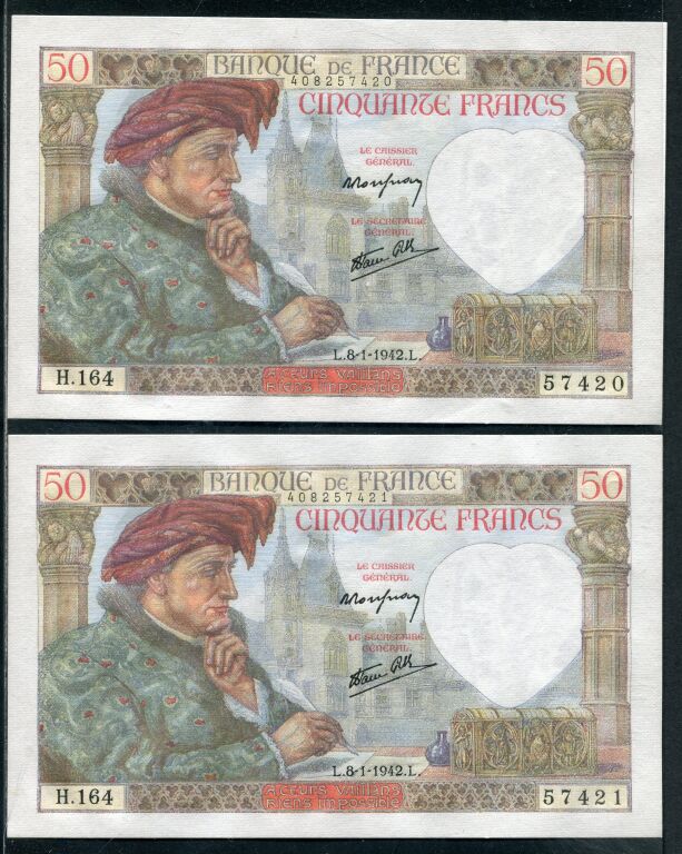 8 janvier 1942, alphabet H 164. - PAIRE 2 billets neufs se suivant n° 57420 + 57421