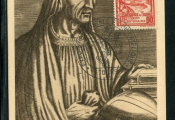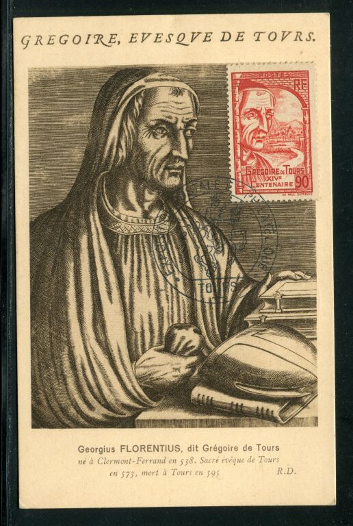 FRANCE - CARTE MAXIMUM du timbre 14e centenaire de Georgius Florentius, dit Grégoire de Tours, né à Clermont Ferrand en 538, sacré évêque de Tours en 573, mort à Tours en 595 - Porte au recto timbre n° 442 gravure Grégoire de Tours, oblitération grand format illustré de l' exposition postale & philatélique de Tours le 2 juillet 1951. Au dos également timbre n° 882, St Jean Baptiste de la Salle, même oblitération + griffe " le Musée Postal à travers la France - Tours - Carte numéro 442 A des Maximaphiles Français.