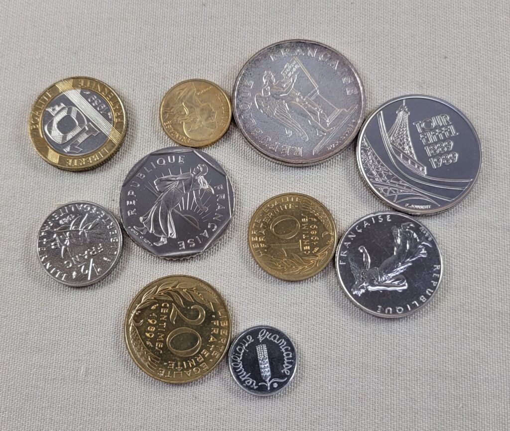 FRANCE - Collection de DIX MONNAIES 1989, fleurs de coins provenant d'un coffret B.U. : 1c inox, 5c + 10c + 20c Lagriffoul, demi franc + un franc + 2 francs semeuse + 5 F commémorative Tour Eiffel + 10 F bicolore génie de la Bastille + 100 francs en ARGENTS Droits de l'Homme.