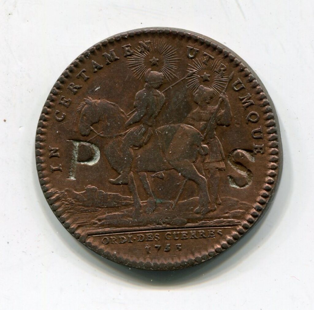 LUD.XV.REX.CHRISTIANISS buste à droite signé D (Duvivier), variante de signature non répertoriée dans le Feuardent - Revers : IN CERTAMEN UTRUMQUE, cavalier et fantassin, à l'exergue : "ORDI DES GUERRES 1753".