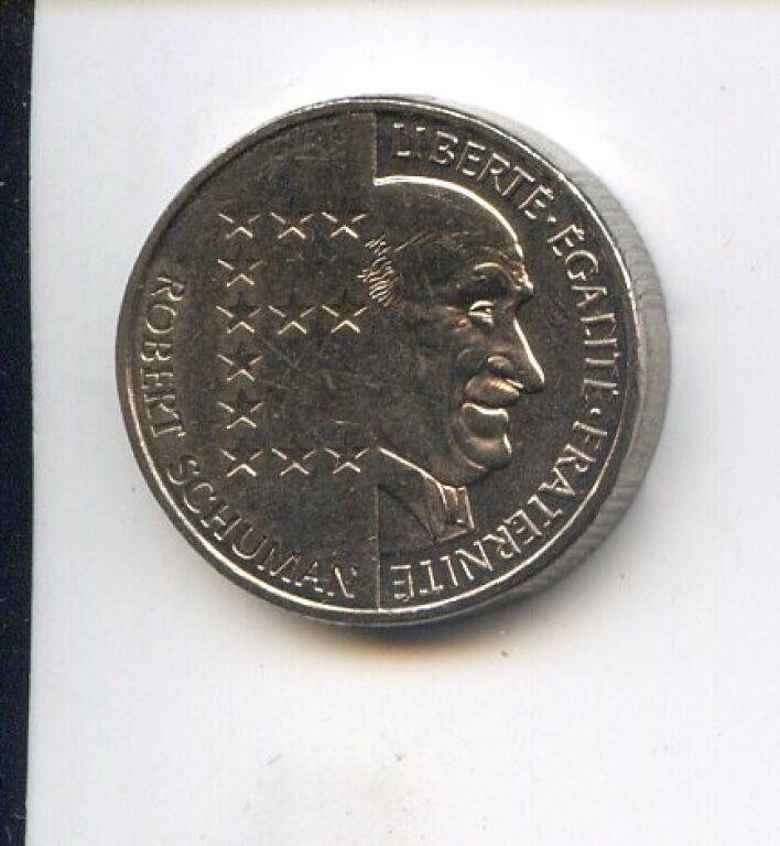 Portrait du père de l' Europe, profil à droite, pour moitié, l' autre moitié illustrée d' un " E " formé de 12 étoiles - Revers : coq gaulois stylisé de John Lobban.