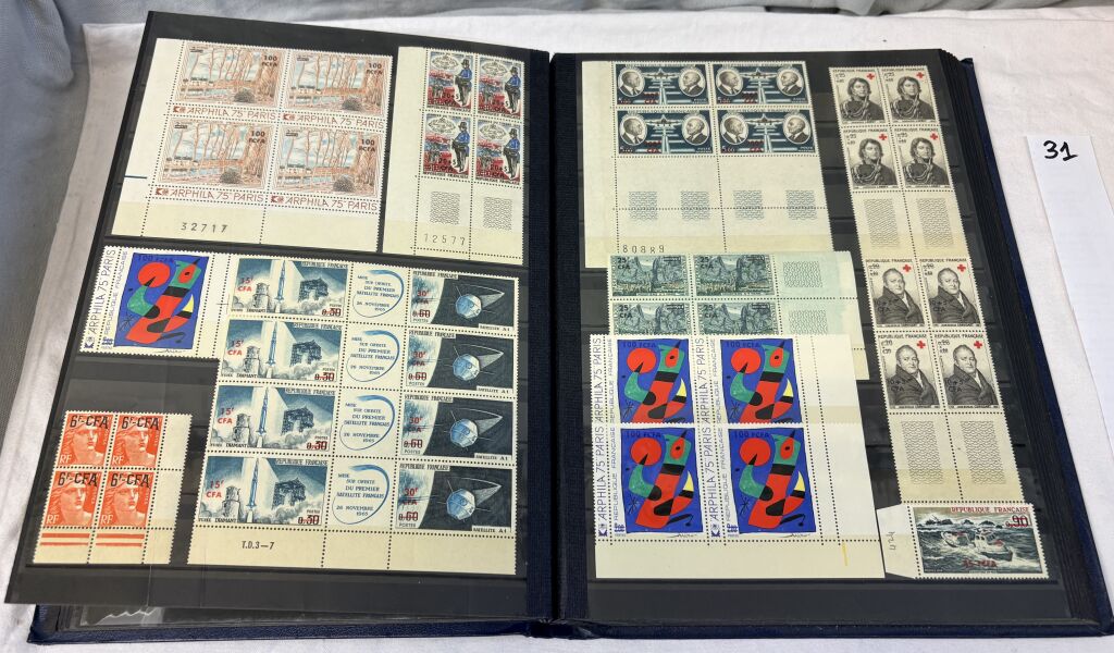 FRANCE REUNION, DEPARTEMENT D'OUTRE MER - classeur, belle collection de timbres neufs, exprimés en francs C.F.A., émis entre 1949 et 1974. La plupart des timbres en blocs de quatre bords de feuilles - Tous les timbres neufs luxe **.