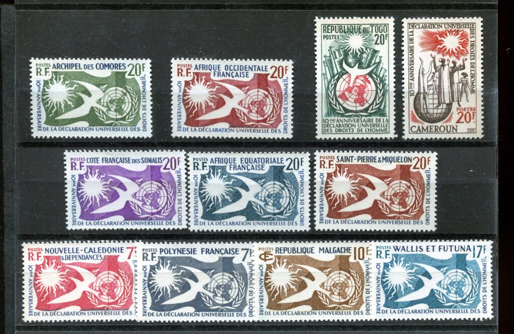 GRANDES SERIES des PAYS D' EXPRESSION FRANCAISE - 1958, 10e anniversaire de la déclaration Universelle des Droits de l' Homme - émission complète de 11 timbres, 11 pays : archipel des Comores / Afrique Occidentale Française / Afrique Équatoriale Française / Togo / Cameroun / Cote française des Somalis / St Pierre & Miquelon / Nouvelle Calédonie / Polynésie / Rép Malgache / Wallis & Futuna. - neufs **