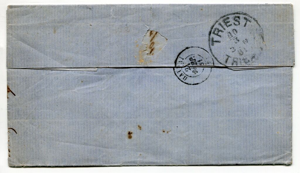 GRECE 1881 - LETTRE pour Trieste - affranchissement 2 timbres au type Mercure, sans chiffres au verso, impression locale : 10 Lepta orange (n° 49) état luxe avec grandes marges dont 1 intégrale avec morceau du timbre attenant + 20 Lepta bleu foncé (court en marges) numéro 50 - Diverses oblitérations, arrivée Trieste 10 mars 1881.