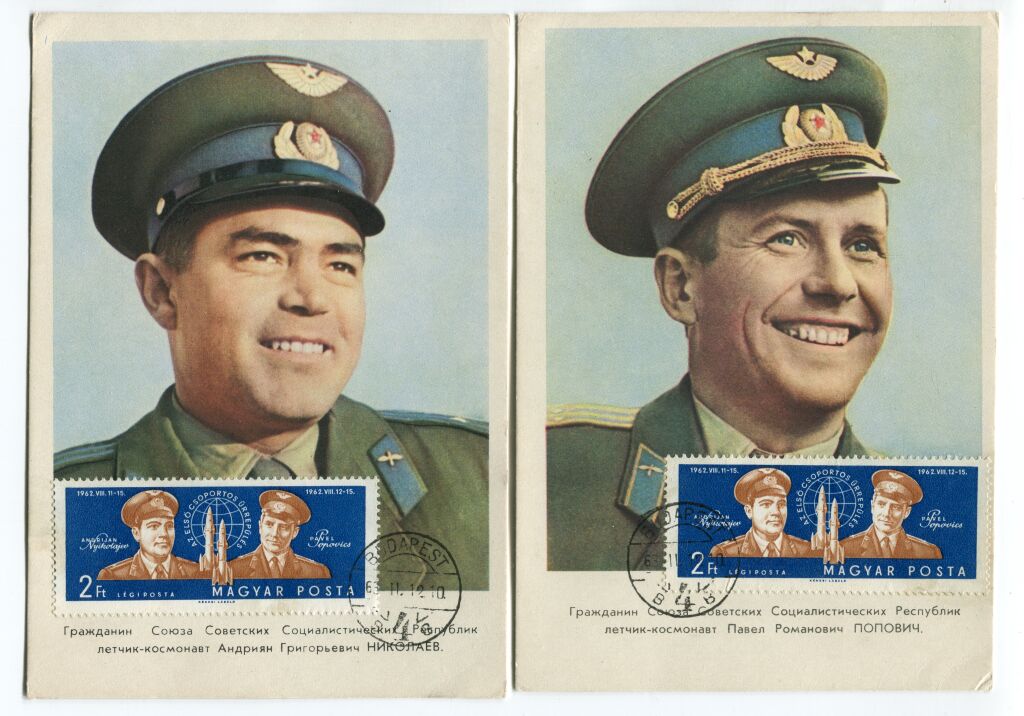 Portraits des cosmonautes NIKOLAEIV et POPOVITCH avec timbre avion 242. Chacun avec timbre avion 242, au recto, sur deux cartes maximales portraits en couleurs de chacun des héros du cosmos, cartes éditions officielles soviétiques du journal LA PRAVDA - Les 2 timbres oblitérés BUDAPEST 11 décembre 1963.