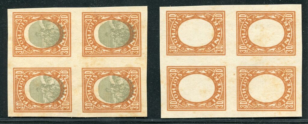 INGRIE 1920 (*) - deux blocs de quatre du n° 9 " Moissonneur " 30 penni jaune-brun & vert.