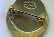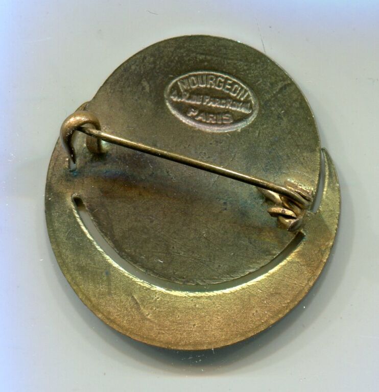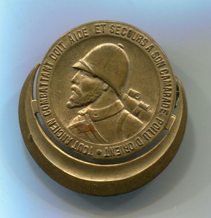 Rond 24 mm au dessus d'un croissant. En légende circulaire TOUT ANCIEN COMBATTANT DOIT AIDE ET SECOURS A SON CAMARADE POILU D' ORIENT ; en centre, de profil buste de soldat en tenue avec casque colonial. Insigne avec épingle mobile au dos, signature fabricant MOURGEON 4 rue Parc Royal Paris.