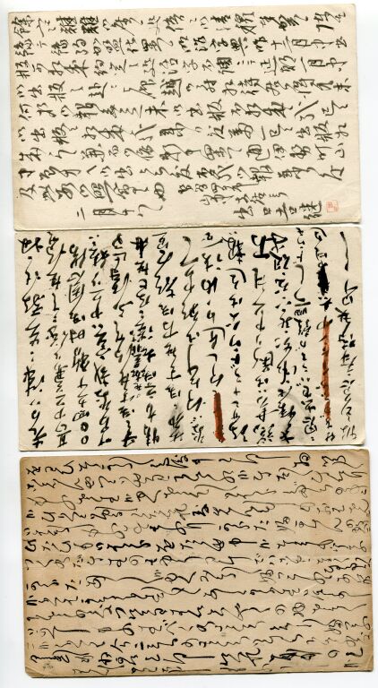 JAPON PHILATELIE / ERINOPHILIE - Fin 19e / tout début 20e siècle - Quatre timbres taxe de commerce, fiscalité judiciaire, surtaxe journée artistique… et 3 cartes postales entiers postaux voyagés avec timbres directement imprimés : 1 Sen rouge + 1 Sen bleu + 5 Sen orange.