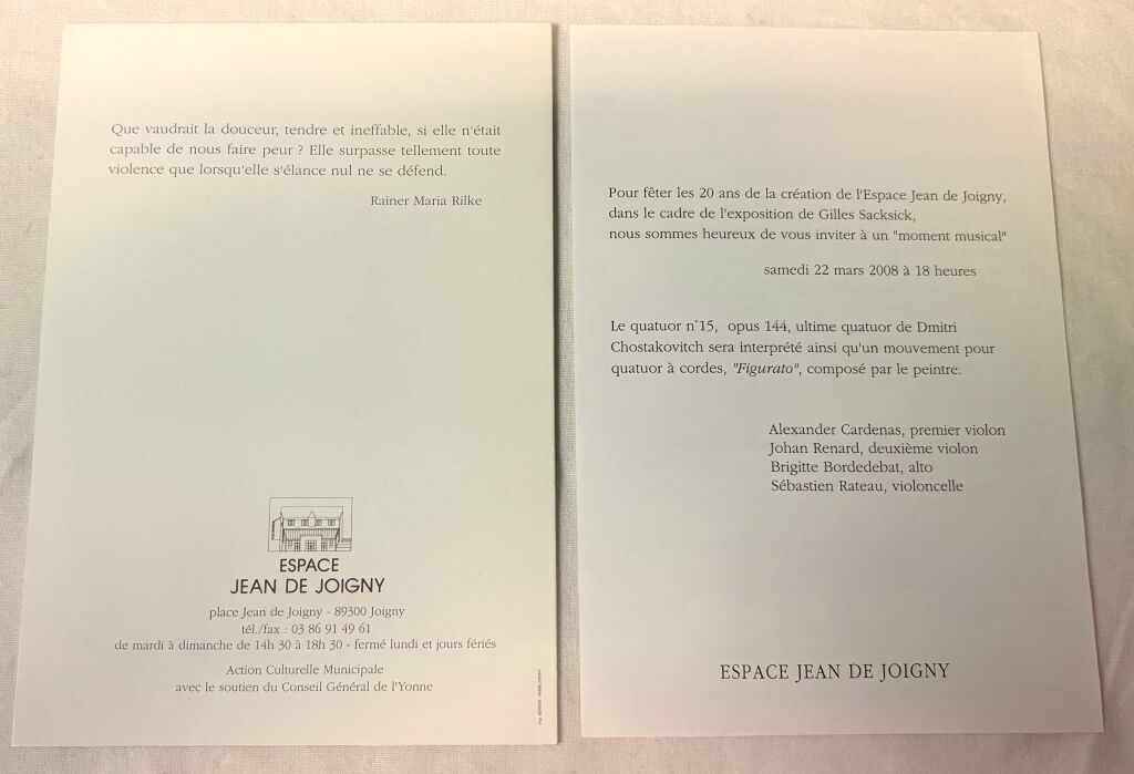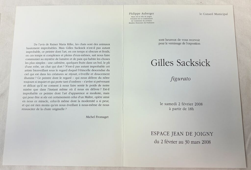 JOIGNY (89) - INVITATION au VERNISSAGE de L'EXPOSITION GILLES SACKSICK " FIGURATO " de la part de Philippe AUBERGER, Maire, à L' Espace Jean de Joigny, 2 février au 30 mars 2008 - Carton ouvrant 21 x 15 cm, présentation de l'artiste, index de ses expositions.
