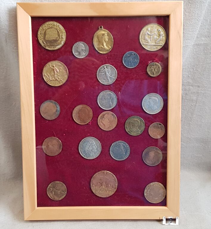 JOLI CADRE SOUVENIR, sous verre bois, contenant 22 MEDAILLES & MONNAIES, tous métaux dont ARGENT. Citons : médaille religieuse " Baiser de Paix ", médaille de mariage en argent (que l' homme ne sépare pas ce que Dieu a uni), médaille de la naissance du Duc d' Orléans 29 septembre 1820, médaille inauguration Tour Eiffel, médaille à l' effigie du Duc d' Orléans 1899 au module de la 10c Dupuis, médaille scolaire de la caisse des écoles 1889 de la rue Kléber à Paris, 20 F Turin argent etc...