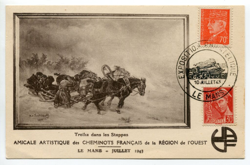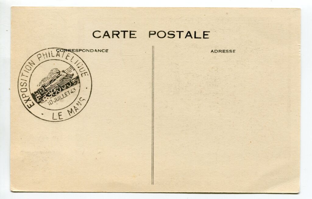 LE MANS ( 72 ) - 10 juillet 1943 - EXPOSITION PHILATELIQUE AMICALE ARTISTIQUE des CHEMINOTS FRANCAIS de la région ouest - Carte postale souvenir illustrée avec timbre Maréchal Pétain 70c orange n° 511 + 30c Mercure rouge n° 412. OBLITERATION COMMEMORATIVE grand format illustrée d'une locomotive vapeur rapide.
