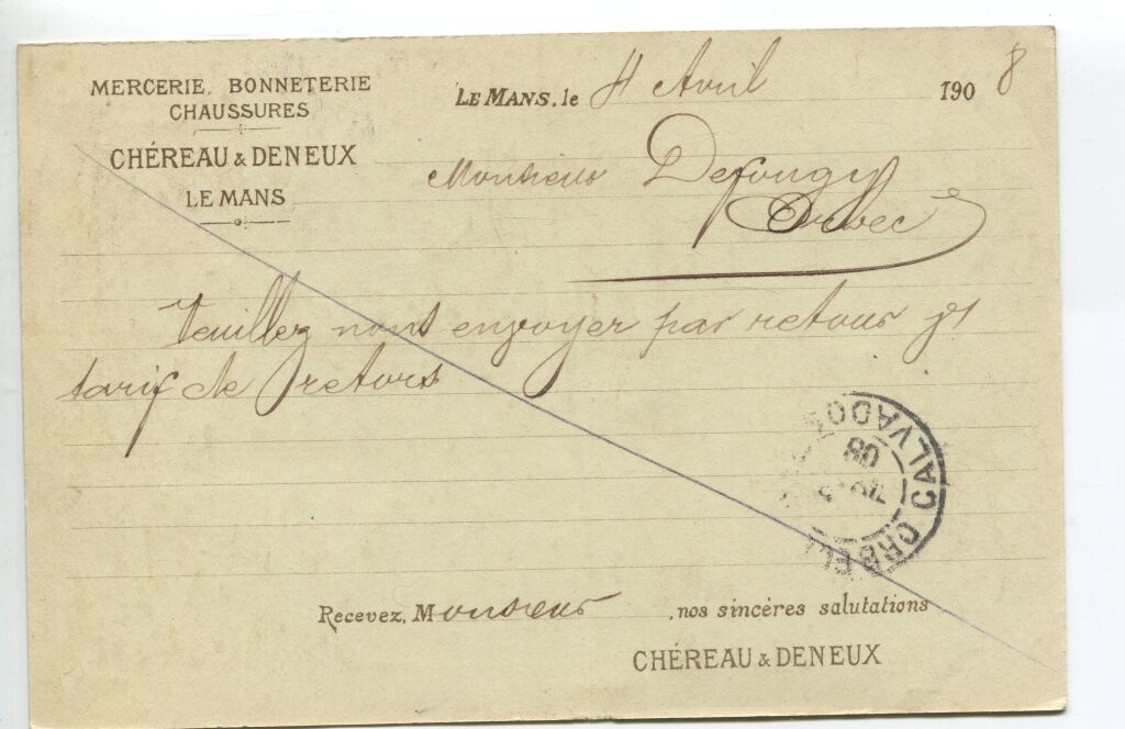 LE MANS (72) - carte postale publicitaire correspondance de CHEREAU & DENEUX MERCERIE-BONNETERIE-CHAUSSURES " FIL au PONT en x ". - 1908.