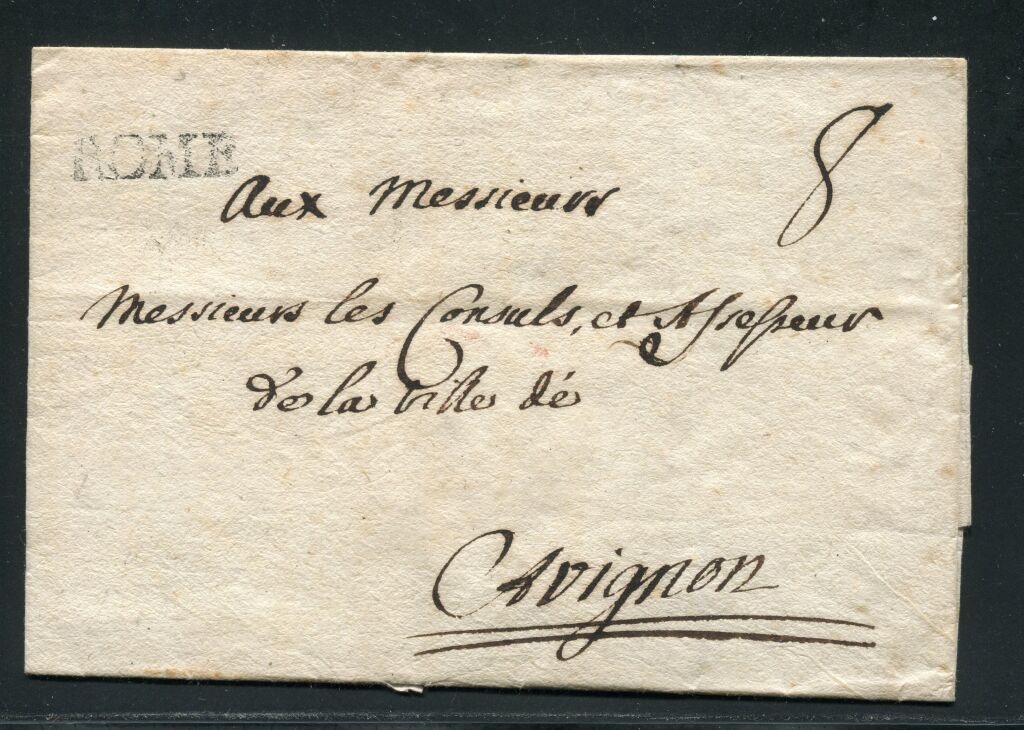 Pli en port dû à des destination " aux Messieurs les Consuls, et questeurs, de la ville de AVIGNON. - Porte griffe, frappe en noir, 22 x 6 mm " ROME ". - Pothion indice 14