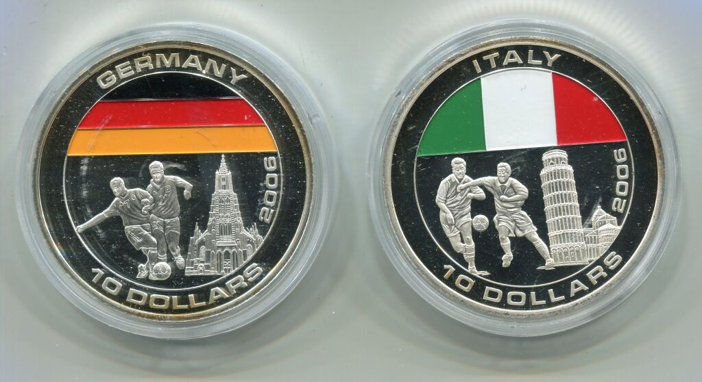 - 10 Dollar équipe Italienne - phase de jeu et tour de Pise, monnaie colorisée avec émail aux couleurs du drapeau italien ; revers armes du Libéria.