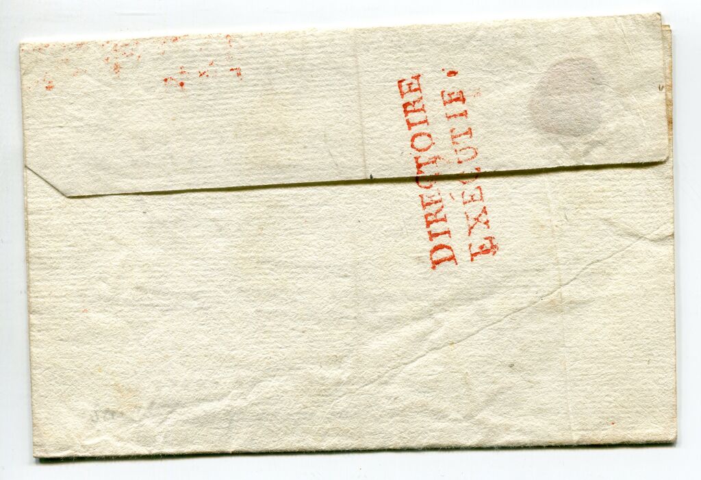 MARCOPHILIE - BUREAUX SPECIAUX, FRANCHISES & CONTRESEINGS. 1er ventôse l' An 5 ( 19 février 1797 ) Lettre NON TAXEE au départ de Paris pour les bouches du Rhône avec marque de départ, frappe en rouge, sur 2 lignes : " DIRECTOIRE. EXECUTIF. " 12 x 35 mm. Porte également, frappe en rouge, lettre " P " dans un triangle ouvert 12 mm, indicatif de la Grande Poste de Paris apposé au recto des lettres à destination des lettres hors Paris. - Au dos, comme marque de fermeture, porte à nouveau la griffe Directoire Exécutif.