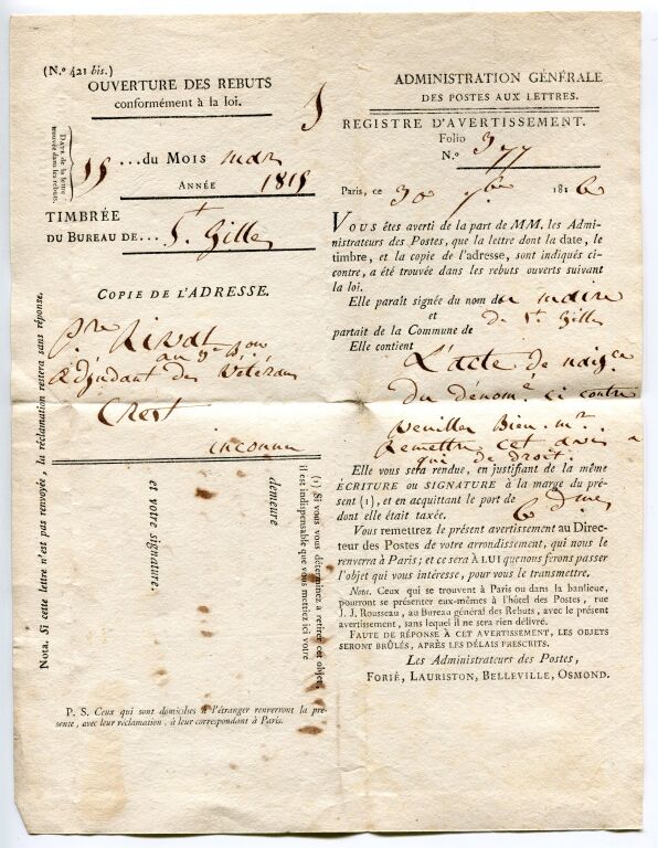 " 30 septembre 1816, vous êtes averti…a été trouvée dans les rebuts ouverts suivant la Loi. Elle contient... Elle vous sera rendue... en acquittant le port de 6 décimes. Vous remettrez le présent avertissement au Dr des Postes qui nous le renverra à Paris et ce sera à lui que nous devrons passer l'objet pour vous le transmettre. Faute de réponse les objets seront brulés.."