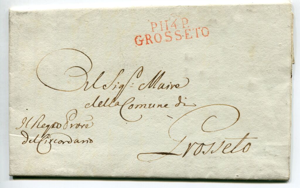 Très belle marque linéaire 2 lignes, 11 x 38mm, frappe en rouge P 114 P. / GROSSETO.