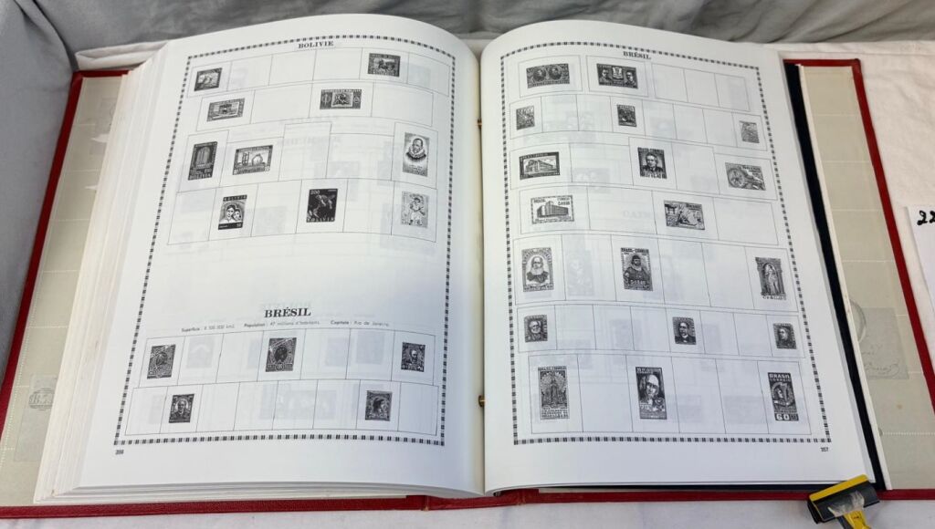 Traditionnel album pour débutant de la collection de timbres - 415 pages avec cases pour placer les timbres, chaque pays actuels ou disparus représentés par continent. En tête d'ouvrage grande cartographie en couleurs - 31,5 x 26,5 x 5,5 cm.
