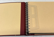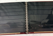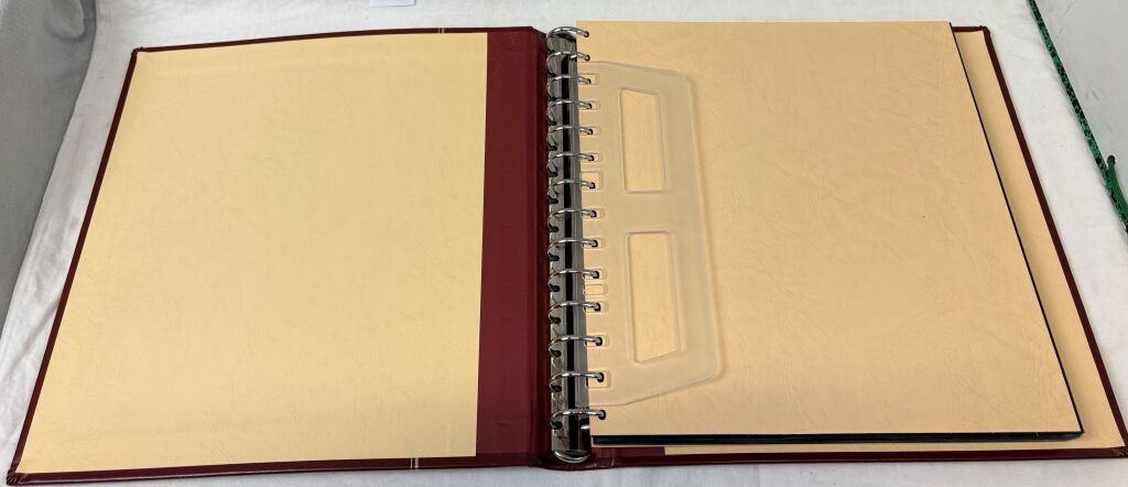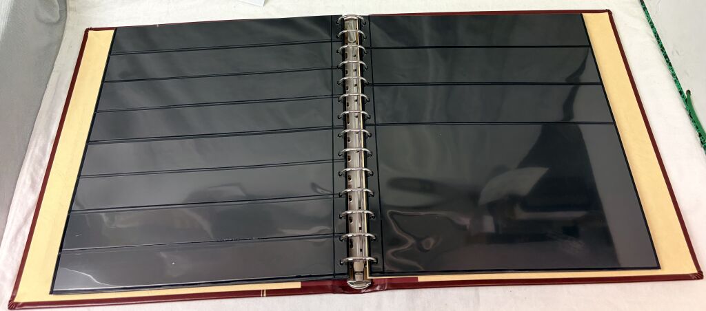 MATERIEL - ALBUM SAFE pour TIMBRES et documents - Reliure mobile à 14 anneaux rouge de type favorite revêtement Skaï (référence gamme luxe 807) rouge avec son boitier assorti - Contient 50 pages (25 feuilles) différentes hauteurs de bandes, feuilles de type ' Garant " (gamme 700) à bandes transparentes soudées sur support rigide noir.