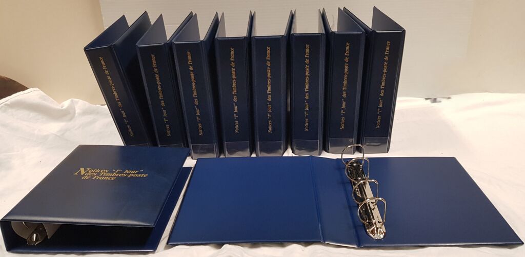 MATERIEL " LA POSTE " - LOT de DIX RELIURES MOBILES bleues, lettrage Or, pour classer les "notices philatéliques officielles" sur vélin avec timbre oblitéré 1er jour.