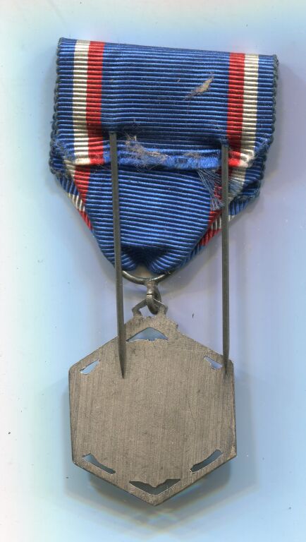 Médaille de distinction classe argent de L' UNION des SOCIETES de TIR FRANCAIS (U.S.R.F.) - Module hexagonal fusils croisés sur couronne de feuilles de laurier.