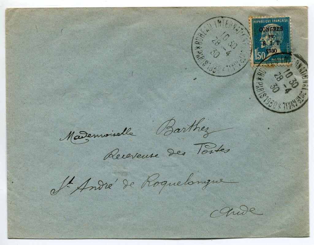 PARIS (75) - 28 avril 1930 - REUNION du CONSEIL D'ADMINISTRATION du BUREAU INTERNATIONAL du TRAVAIL à PARIS - Lettre avec affranchissement concordant avec timbre commémoratif 1 F 50 Pasteur avec surcharge en noir 'CONGRES du B.I.T. 1930 (n° 265), timbre seul sur lettre voyagée pour St André de Roquebrune / Aude".