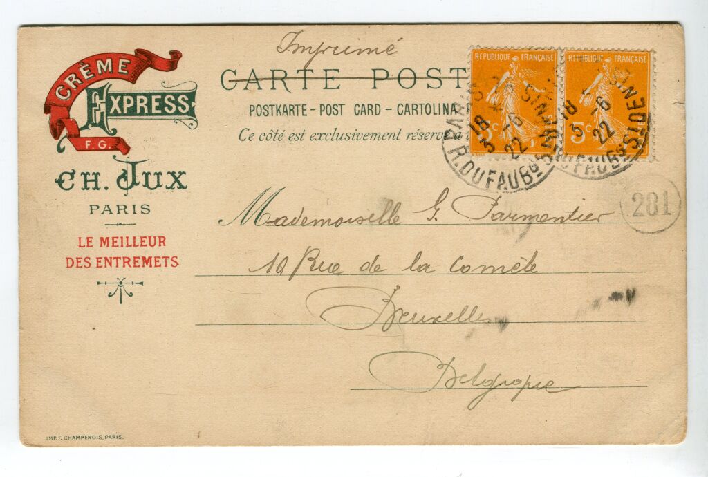 PARIS (75) - EXPOSITION UNIVERSELLE de 1900, vue depuis la Seine, impression chromolithographie couleurs de Champenois, du PALAIS des FORETS, CHASSE et PECHE. Carte postale publicitaire voyagée avec, au verso, PUBLICITE pour la CREME EXPRESS CH. JUX à Paris " le Meilleur des entremets ".