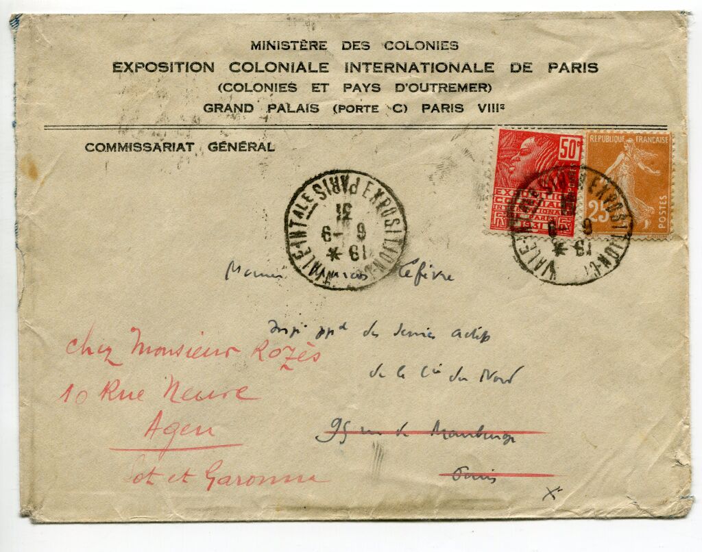 Au verso, grand cachet violet COMMISSARIAT des FETES - COMMISSARIAT GENERAL de L'EXPOSITION COLONIALE", flamme machine Flier employée comme arrivée (et réexpédition) 7 lignes ondulées, bloc dateur PARIS X quai de Valmy 7 - IX - 1931. Également flamme machine Krag comme arrivée slogan en continu : " Pour Paris / mettre le numéro de l'arrondissement ", bloc dateur AGEN R.P. 18-IX.