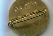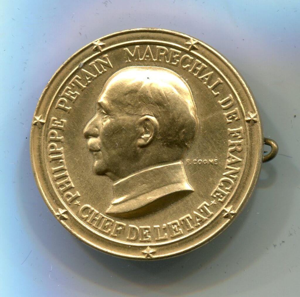 Badge avec épinglette, aluminium doré, œuvre du graveur F. Cogné, en centre profil tête nue haut relief légende circulaire : " PHILIPPE PETAIN / MARECHAL de FRANCE / CHEF de L' ETAT - circulaire 30 mm - au dos homologation censure " O.A. 277 2 "