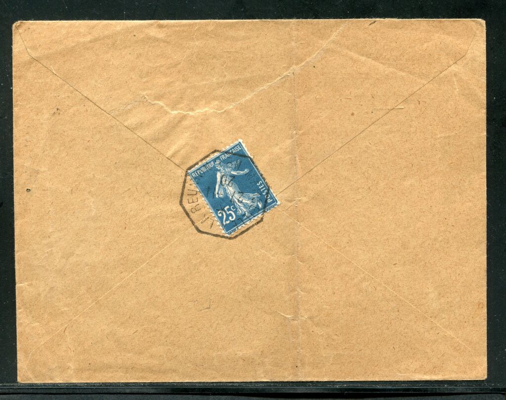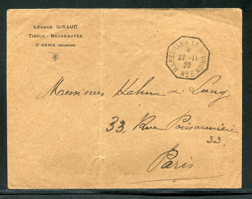 POSTE MARITIME - Lettre au départ de SAINT - DENIS / REUNION pour Paris - Oblitération octogonale type D 4, " MARSEILLE à la REUNION n° 3 27 NOVEMBRE 1920 "- Affranchissement 25c bleu semeuse camée n° 140, timbre apposé au verso comme fermeture.