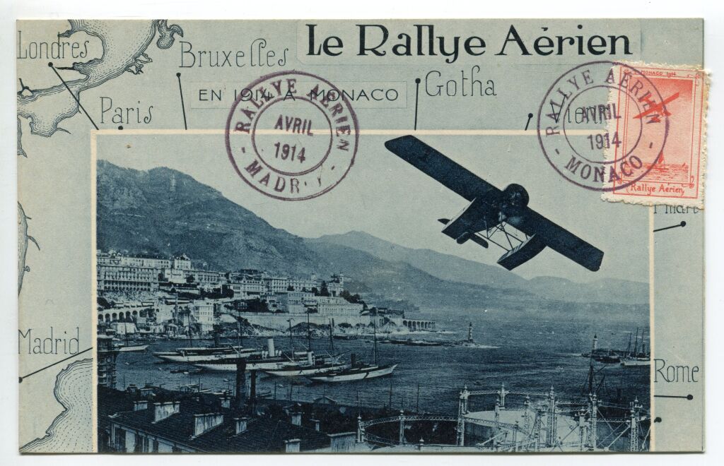 la carte postale porte au verso la mention : "cette carte postale a été transportée 1300 kilomètres en aéroplane, au dessus de le terre et de la mer, traversant l'Europe pour arriver à Monaco sous le contrôle officiel des Aéro-Clubs Européens ".