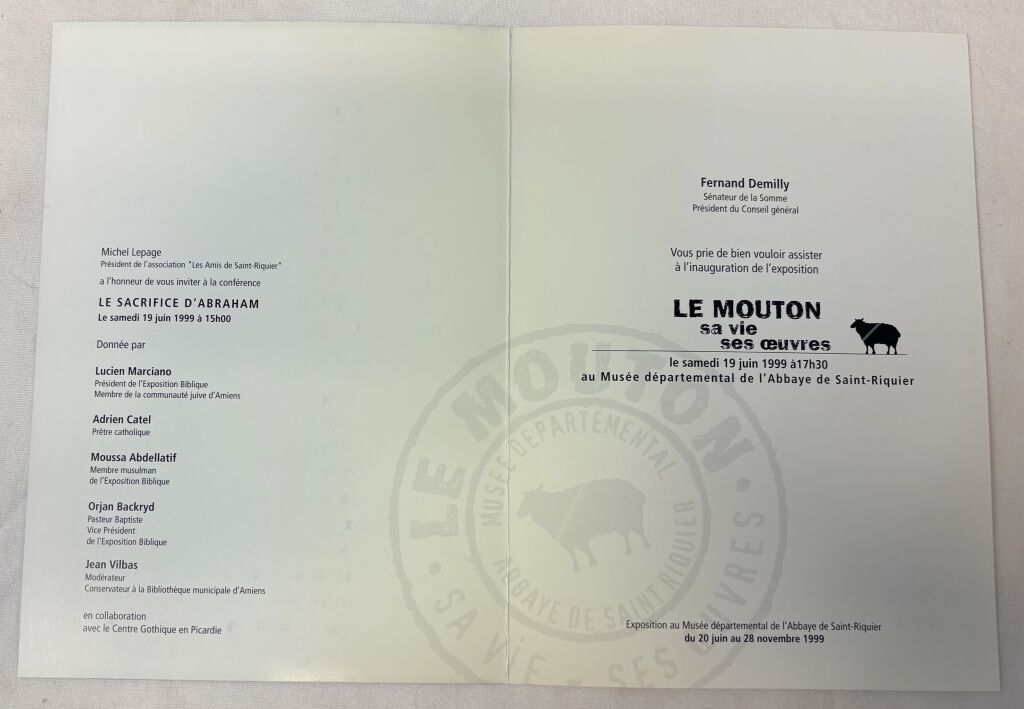 SAINT RIQUIER 80) - INAUGURATION de L'EXPOSITION "LE MOUTON, SA VIE, SES OEUVRES " - Centre culturel du musée départemental de l'Abbaye de St Riquier Conseil Général de la Somme - Carton ouvrant d'invitation pour le 19 juin 1999 à l'exposition et à la CONFERENCE "LE SACRIFICE D'ABRAHAM", conférence donnée par Lucien Marciano Président de l'exposition biblique, membre de la communauté juive d'Amiens, Adrien Castel prêtre catholique et Moussa Abdellatif membre musulman, Orjan Backryd Pasteur...