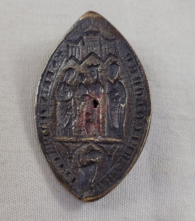 En bronze, en forme de mandorle 60 x 40 mm à légende circulaire en latin gravée en creux en négatif. En centre St pierre tenant les clefs et la bible, sous un dai, fleurs de lis et SPE dans le champ .- 68,29 grammes. - au dos arête pour préhension.