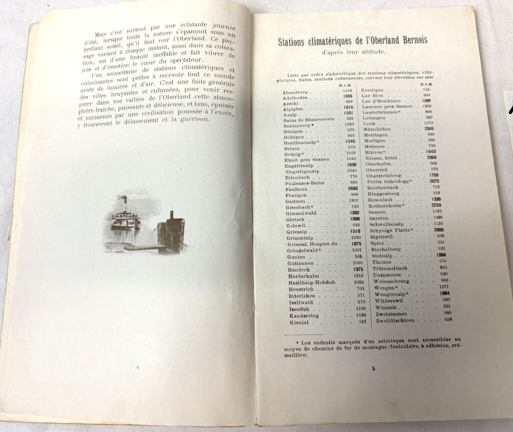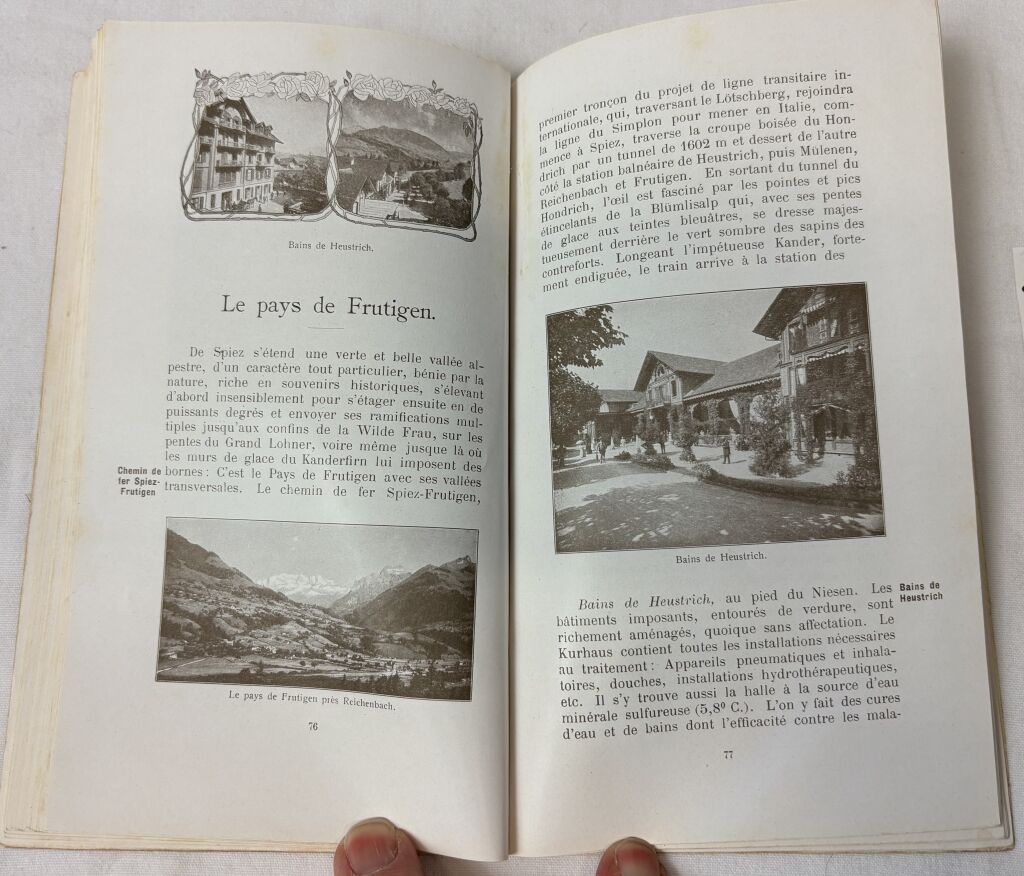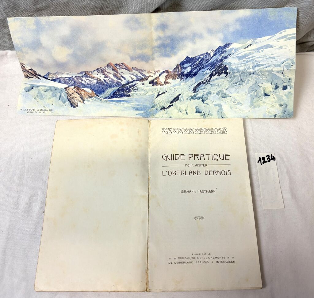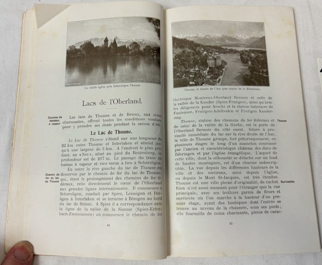 138 pages bien illustrées d'après les photographies de Wehli frères de Zurich et Hartmann d' Interlaken - Tous les sites touristiques et villages de montagne, les villes, les chemins de fer de montagne et généraux, les curiosités, les horaires des bateaux à vapeur sur les lacs de Thoune & Brienz etc...- complet de sa carte dépliante - 20,5 x 12 cm.