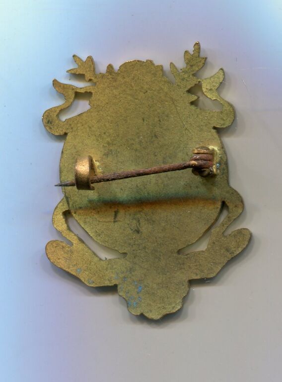 Email grand feu laiton ajouré avec épingle pour port au veston 37 x 28mm.