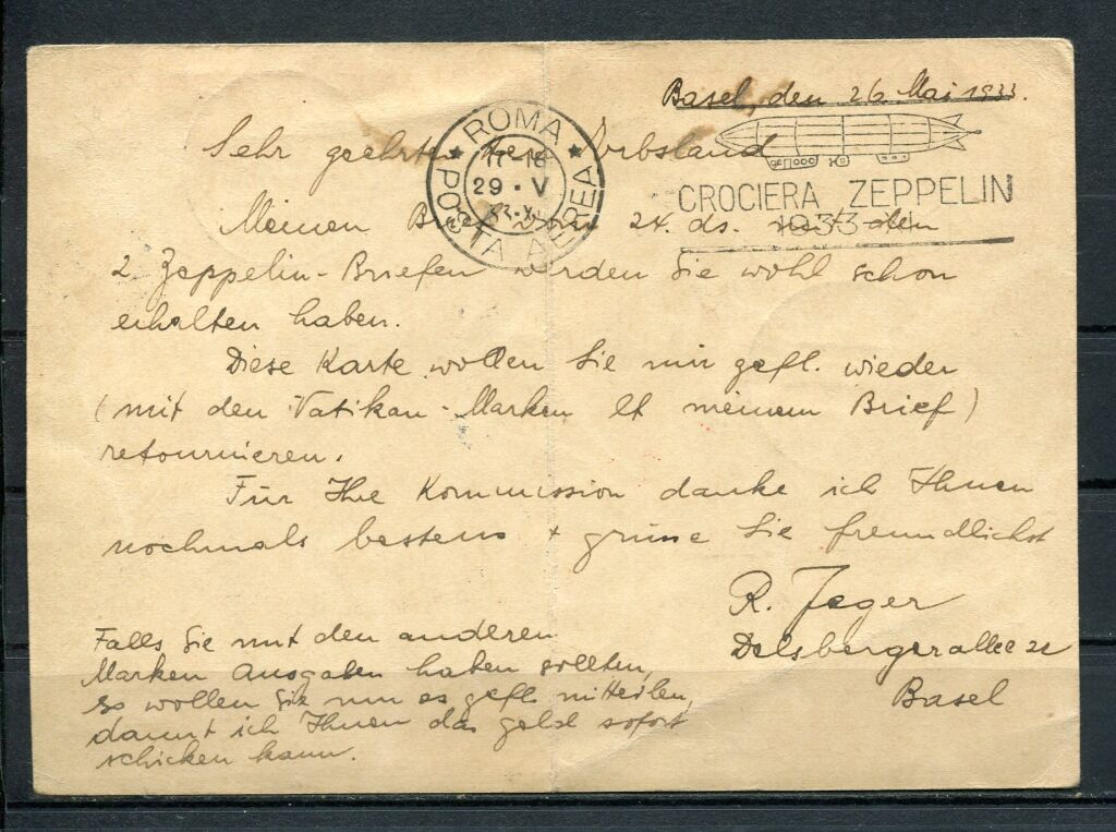VOL PAR DIRIGEABLE du GRAF ZEPPELIN 1933 LZ 127 SUISSE - ROME ( * ).