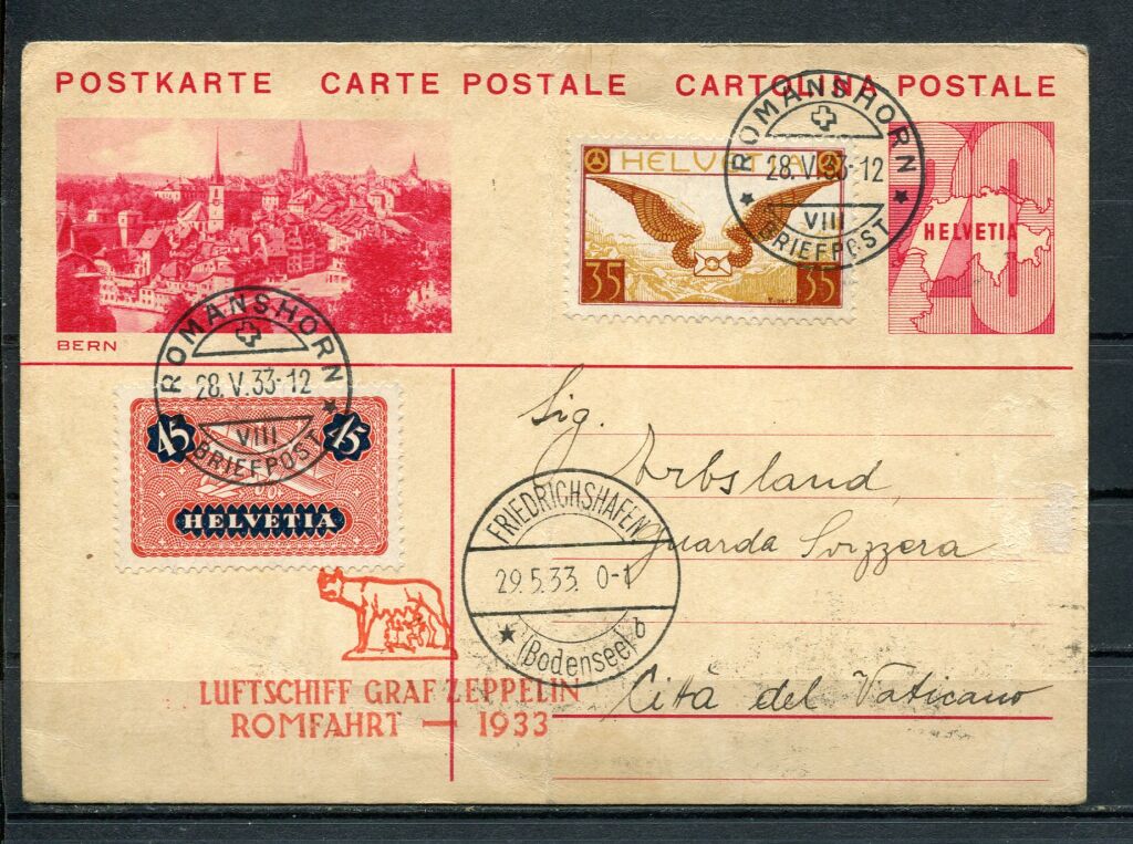 Entier postal illustré Berne à 20c + complément d' affranchissement par timbres mobiles Suisses aviation n° 8, avion biplan, et n° 13, lettre portée par 2 ailes. Cachet de départ ROMANSHORN ( Suisse / Lac de Constance ), cachet à date transit base Zeppelin : FRIEDRICHSAFEN - Belle griffe spéciale commémorative, frappe en rouge, illustrée d' une louve allaitant Romulus et Remus légende : " LUFTSCHIFF GRAF ZEPPELIN ROMFAHRT - 1933 " - au verso correspondance et flamme illustrée du navire aérien commémorative " Croisière Zeppelin 1933 " Roma posta aéra 1933 ".